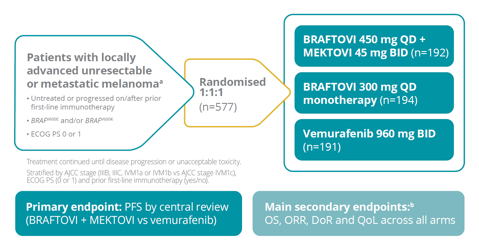 BID, twice daily; ECOG PS, Eastern Cooperative Oncology Group Performance Status; LDH, lactate dehydrogenase; PD-1, programmed cell death protein 1; PD-L1, programmed cell death ligand 1; QD, once daily; ULN, upper limit of normal. aDosing regimen for the combination was BRAFTOVI 450 mg QD + MEKTOVI 45 mg BID and BRAFTOVI 300 mg QD.4